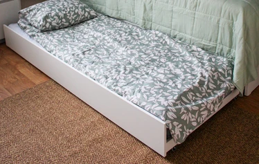 Huoneessa 2 erillistä 90cm leveää sänkyä, joista toisen alta on mahdollista ottaa lisävuode 90cm