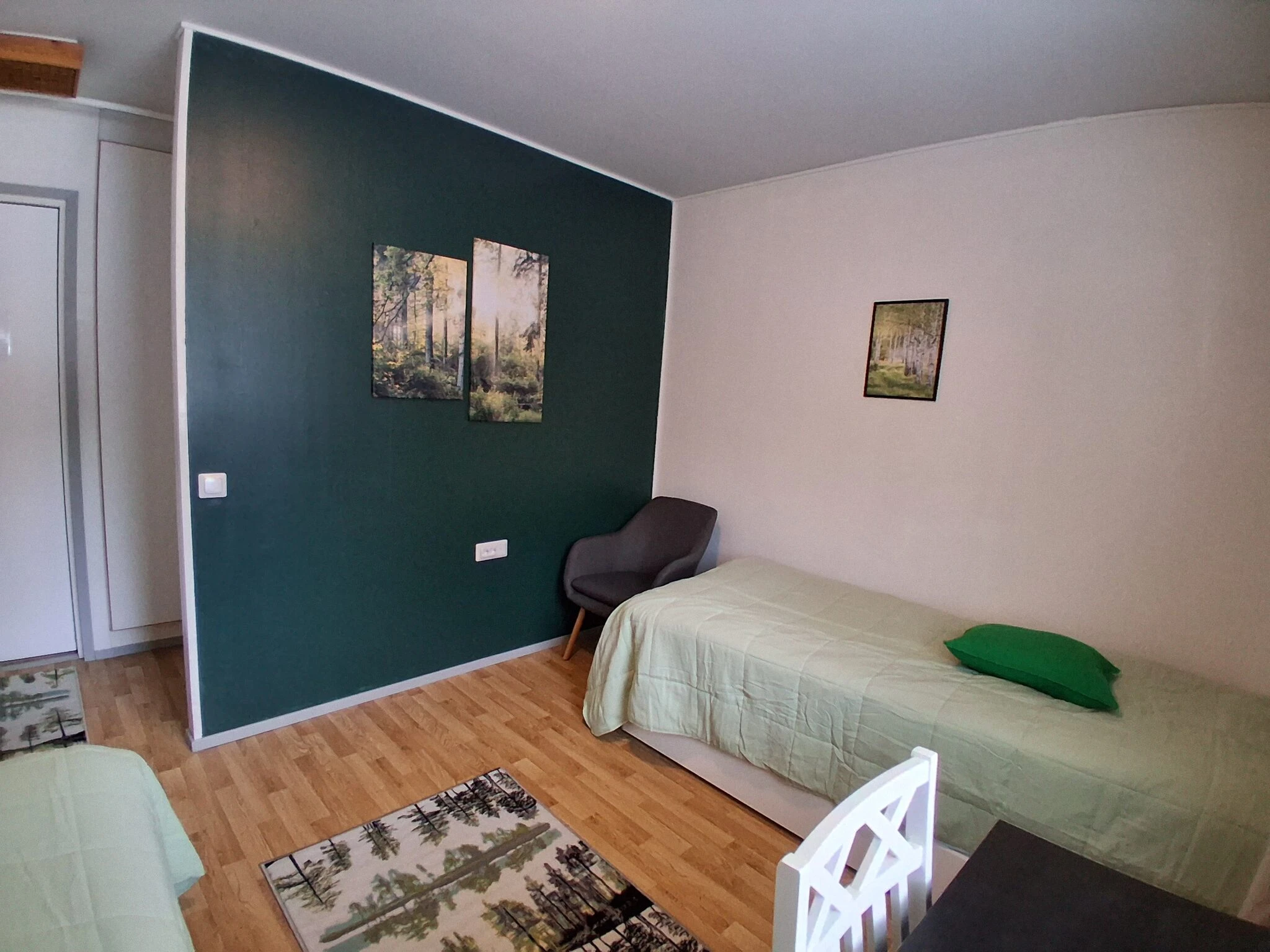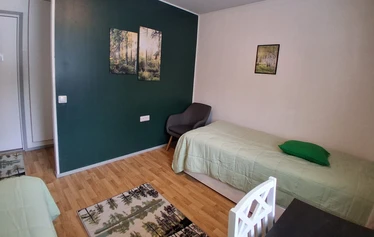 Huone kuuluu 3 huoneen yksikköön, jossa on yhteinen keittiö ja olohuone ja sauna