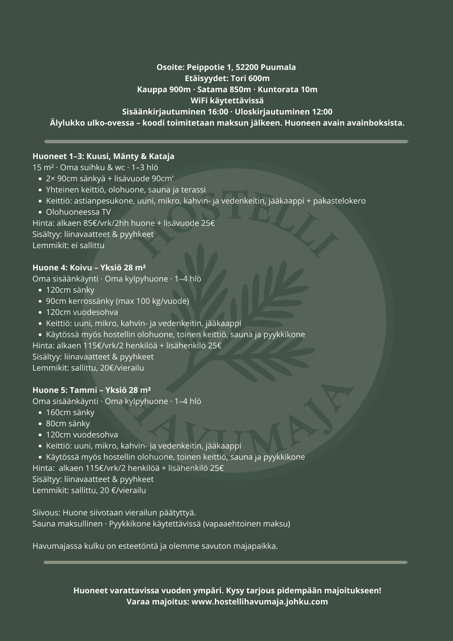 Loppusiivous sisältyy hintaan. Huonesiivous majoituksen aikana ei sisälly hintaan