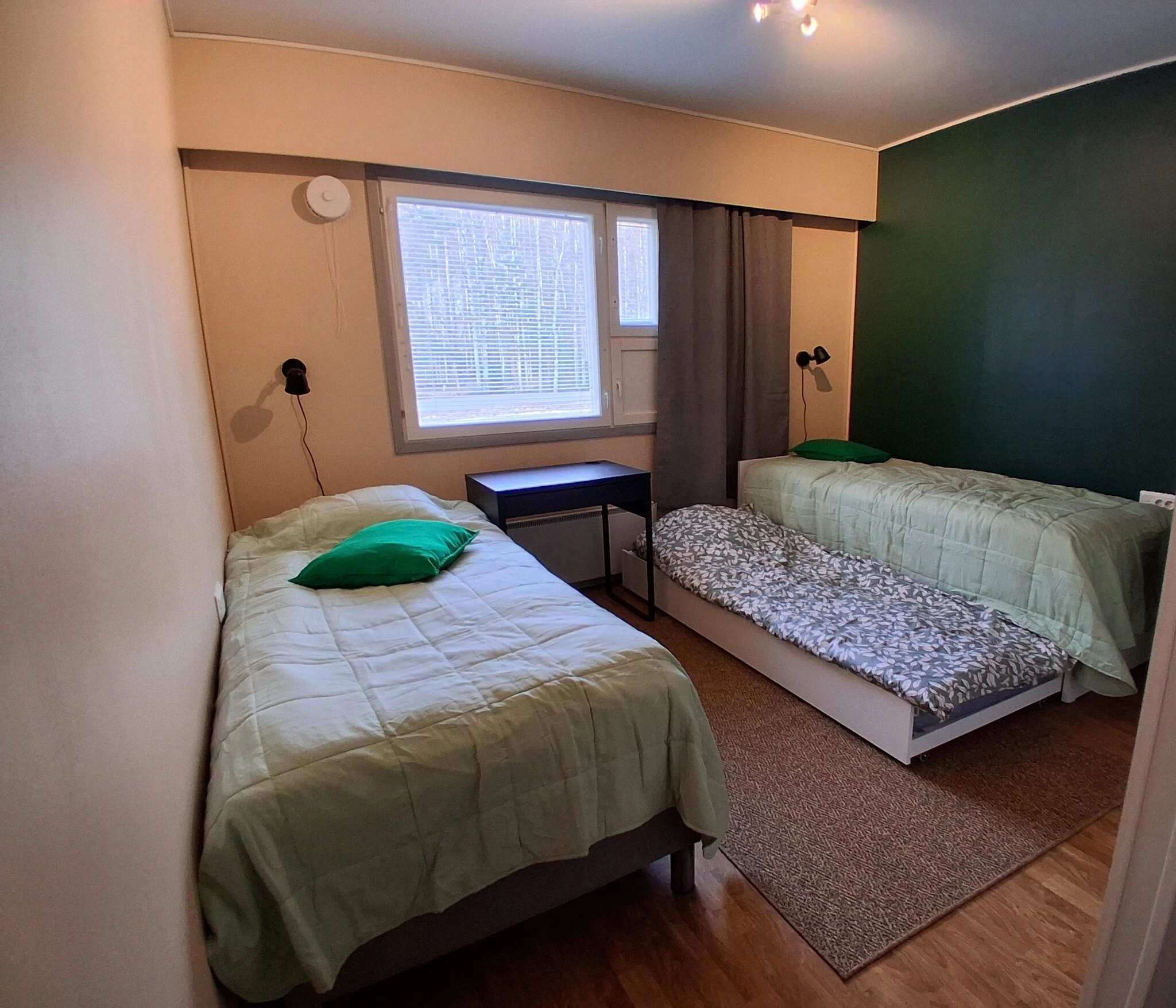 Huoneessa 2 erillistä 90cm leveää sänkyä, joista toisen alta on mahdollista ottaa lisävuode 90cm