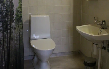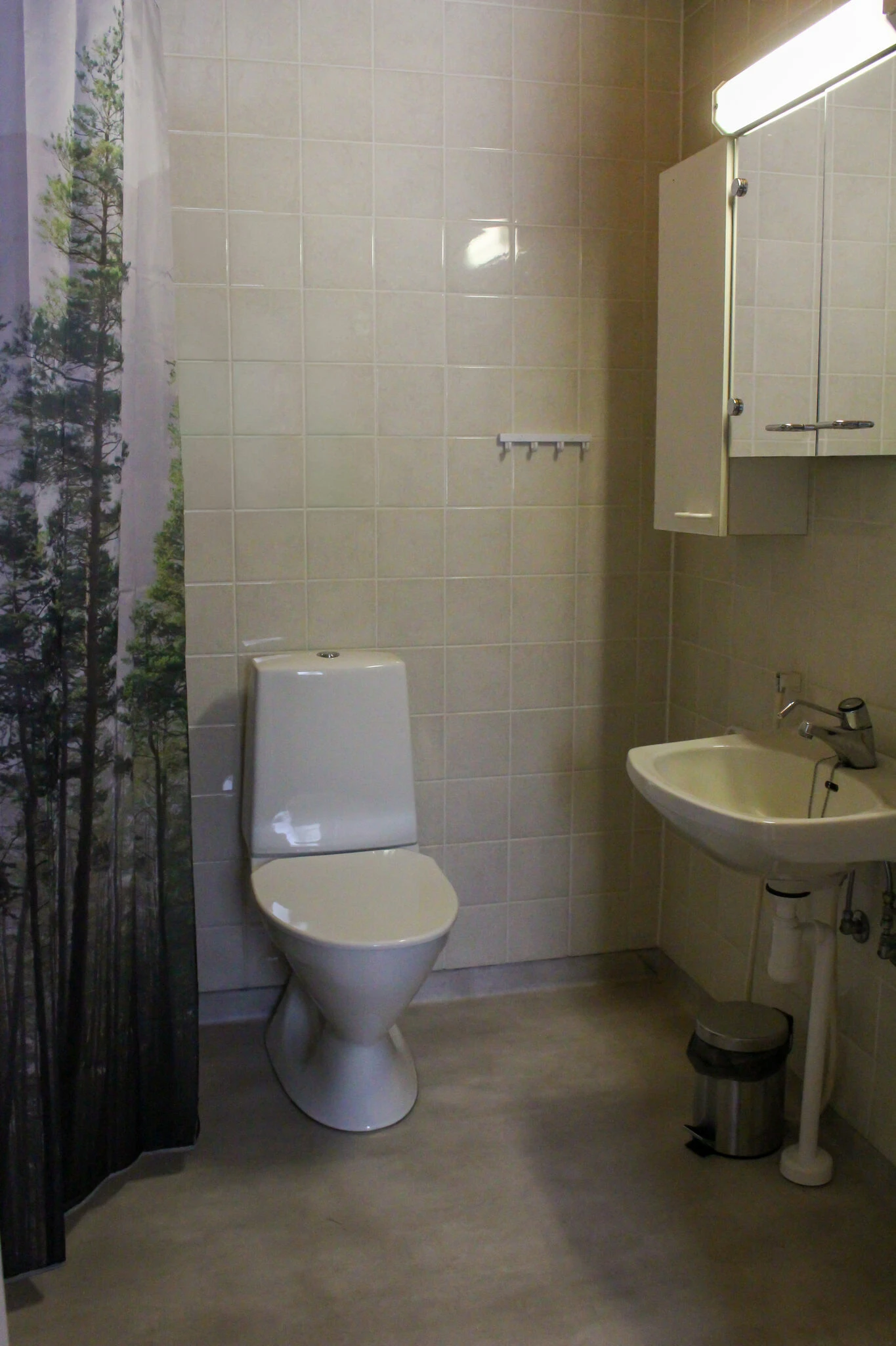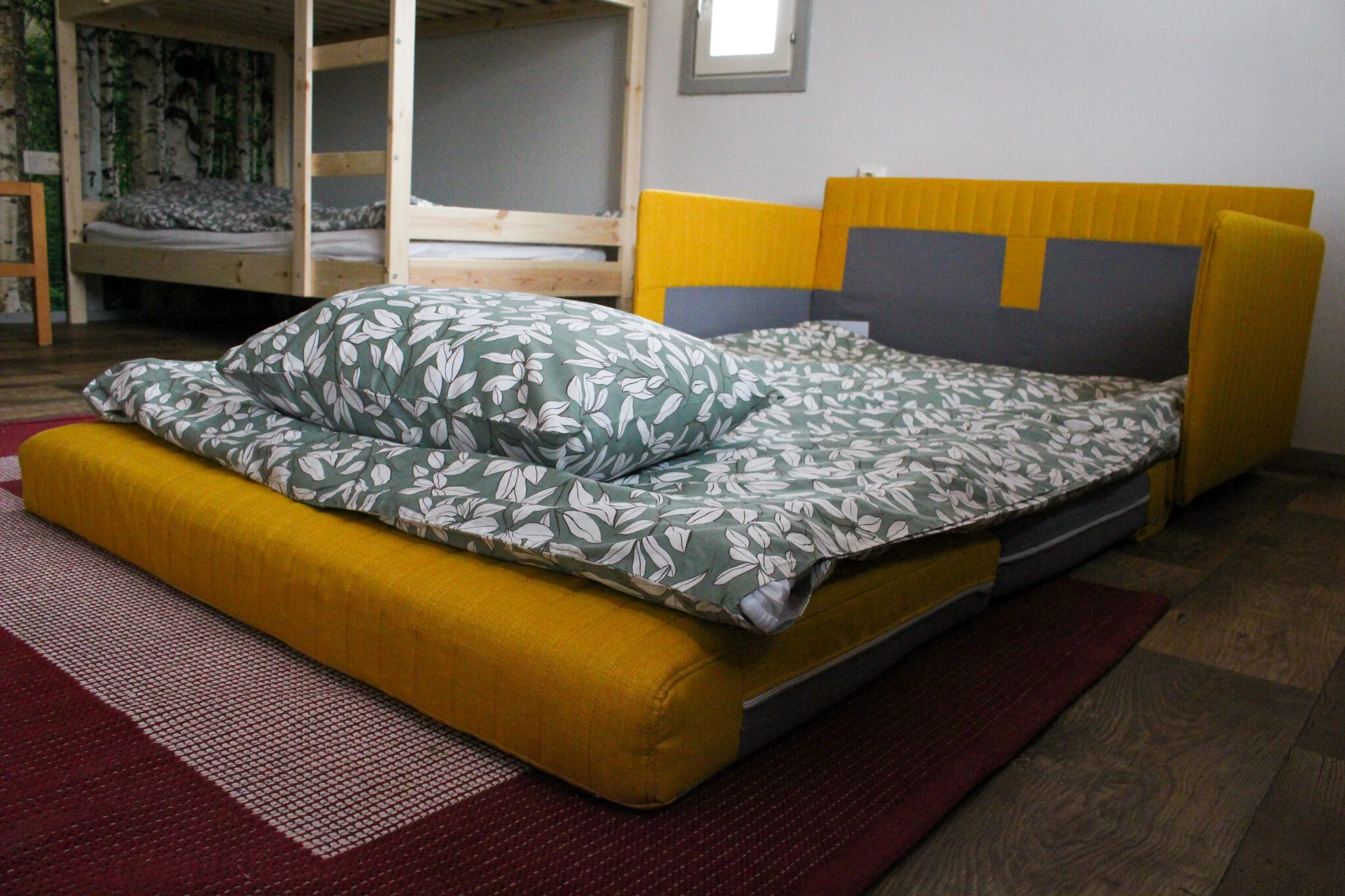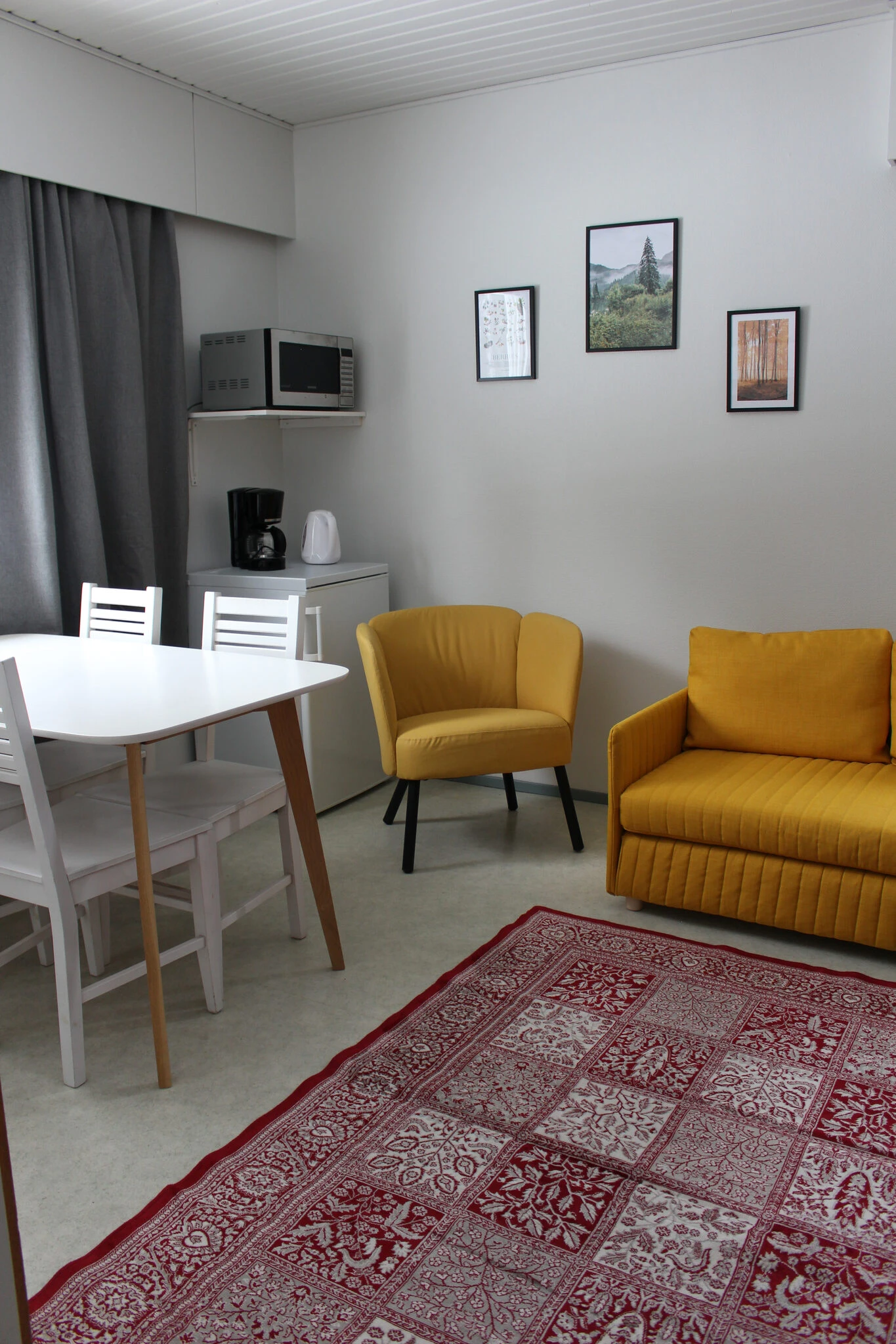 Yksiön majoittujat saavat käyttää myös hostellin puolella olevaa olohuonetta, toista keittiötä sekä saunaa ja pyykkikonetta.