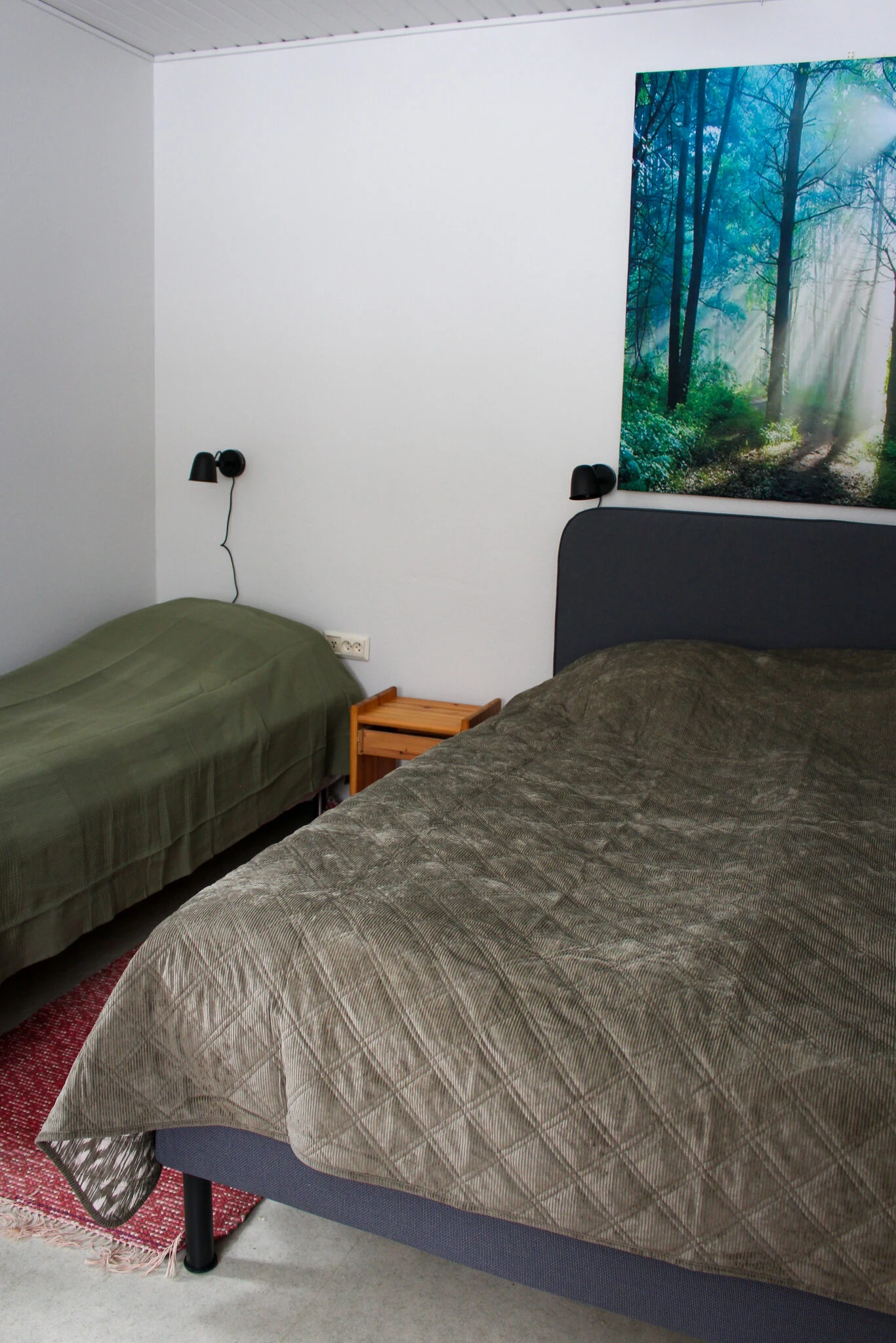 Huoneessa 1x 160cm leveä parisänky, 1x 80cm sänky sekä lisävuoteena valittava 1x 120cm vuodesohva.